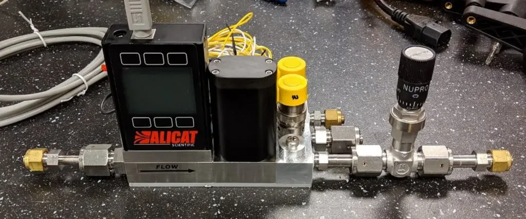 Inchfab 需要一种经济实惠的质量流量解决方案,具有快速响应时间、宽作范围和无预热时间。他们最终选择了 Alicat 质量流量控制器 (MFC),主要是因为其基于层流差压的工作原理所带来的好处。这些控制器为 Inchfab 提供了 0.6% 读数的高精度测量、30 ms 响应时间、0.01% 至 100% 量程比,并且无需预热时间。图 2 显示了 Alicat MFC 在 Inchfab 的 ICP-CVD 系统中的连接方式。