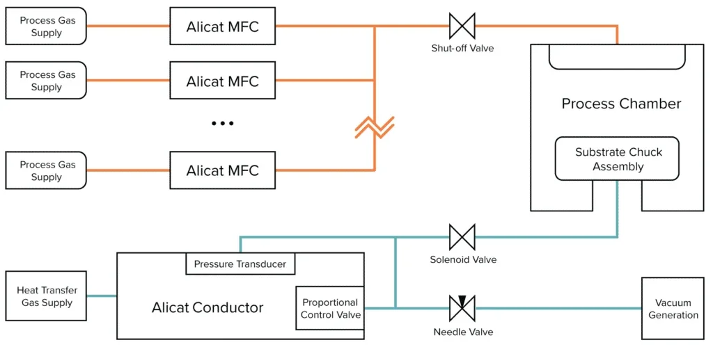 IVC 压力控制器中的真空传感器在基板卡盘层中提供精确的、不受气体影响的压力测量,并且能够独立于流体出口进行布线。由于 IVC 和 MFC 之间有一个通用的数字接口,Inchfab 能够用该设备替换更昂贵的控制器,并移除了几个额外的控制硬件。他们还能够使用标准的直观 Alicat 数字通信协议,从而可以非常简单地监控压力并在需要时更新设定值。图 2 显示了 IVC(标记为 Alicat 导体)如何集成到 Inchfab 的 ICP-CVD 系统中。
