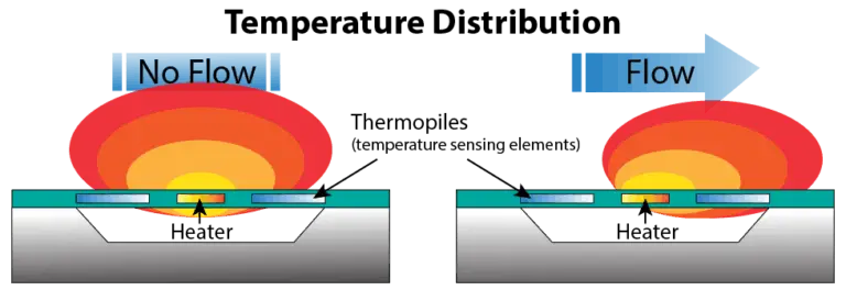 第二种方法涉及测量加热元件(热线或表面)两侧的两点的温度。 当流体通过这个加热元件时,它会将热量输送到下游,从而提高下游传感器的温度,同时降低上游传感器的温度。 由此产生的温差与流体的质量流量相关,受到与第一种方法相同的约束。