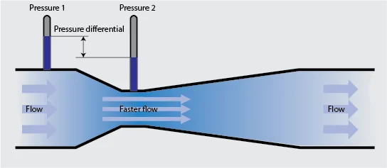 压力传感器测量收缩长度之前和内部的压力,仪表使用伯努利方程计算流体速度。伯努利原理指出,流体的速度与其压力成反比。因此,通过降低已知收缩处的气体压力并测量压差,该设备可以确定体积流量。
